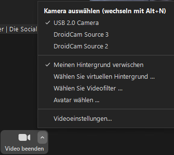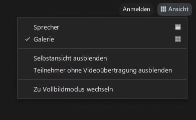 Über die Punkte „Selbstansicht ausblenden“ oder „Teilnehmer ohne Videoübertragung ausblenden“ kannst du dich oder alle Teilnehmer ohne Video ausblenden lassen.