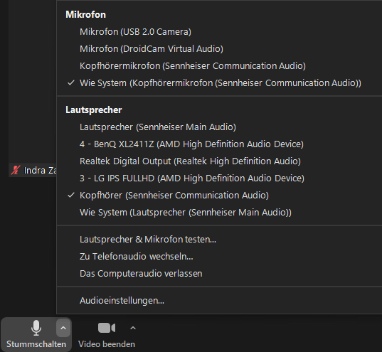 Über den kleinen Pfeil neben dem Mikrofon-Symbol kannst du noch die richtigen Lautsprecher und Mikrofon auswählen. Dort kannst du auch in die Audioeinstellungen gelangen oder dein Mikrofon, sowie Lautsprecher testen.