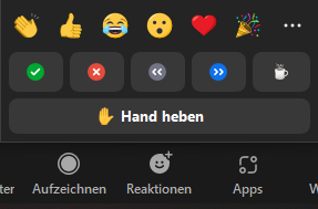 Mit Reaktionen kannst du in in einer Ecke deines Bildes ein Emoji anzeigen lassen. Dort findet sich auch die Schaltfläche „Hand heben“, mit der du signalisieren kannst, dass es eine Frage oder ein Problem gibt. Mit dem Kaffee-Symbol kannst du zum Beispiel auch signalisieren, dass du kurz weg bist. Über die 3 Punkte bei den Reaktionen kannst du auch auf alle anderen Emojis zugreifen.