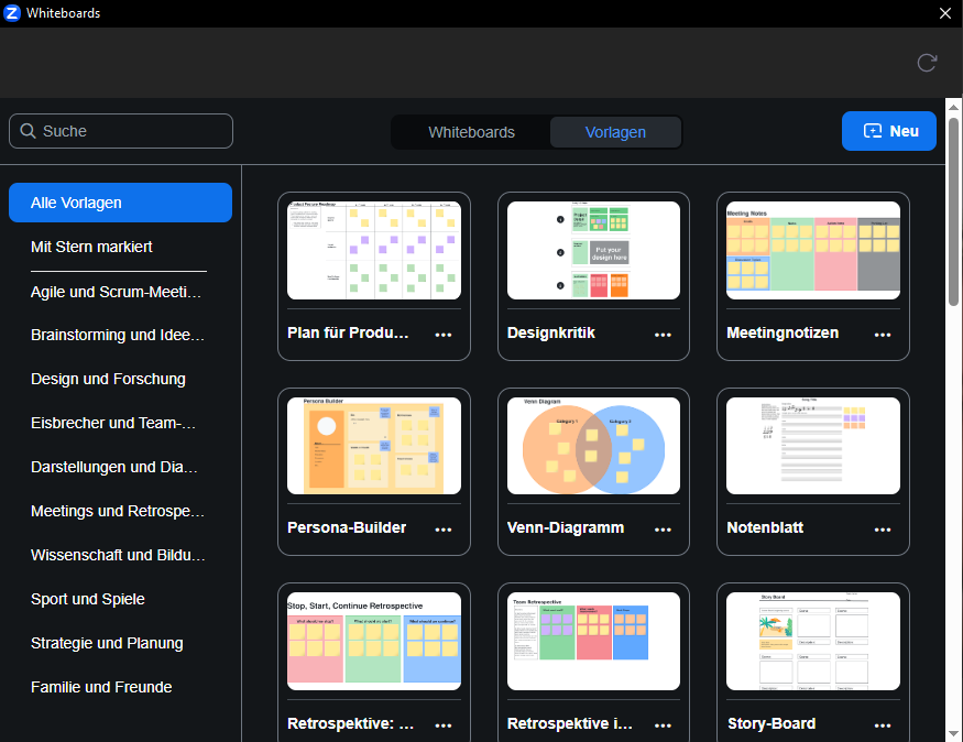 Die Whiteboard Funktion eignet sich super zum zusammenarbeiten und Ideen sammeln. Mit verschiedenen Vorlagen können so gemeinsam Mindmaps, Diagramme, Notizen und vieles mehr erstellt werden. Eine super Möglichkeit um gemeinsam neuen Themen für deinen Social Media Auftritt zu finden 😉