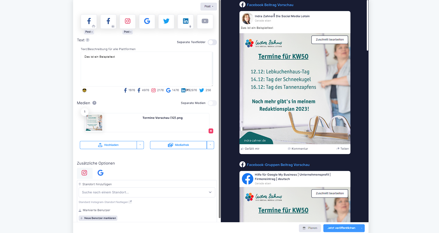 Auf der rechten Seite ist eine Beitragsvorschau. Hier bekommst du einen Eindruck, wie der Beitrag in deinem Feed aussehen wird. In der Feedvorschau siehst du dann auch, ob der Bildausschnitt und Text gut aussieht.