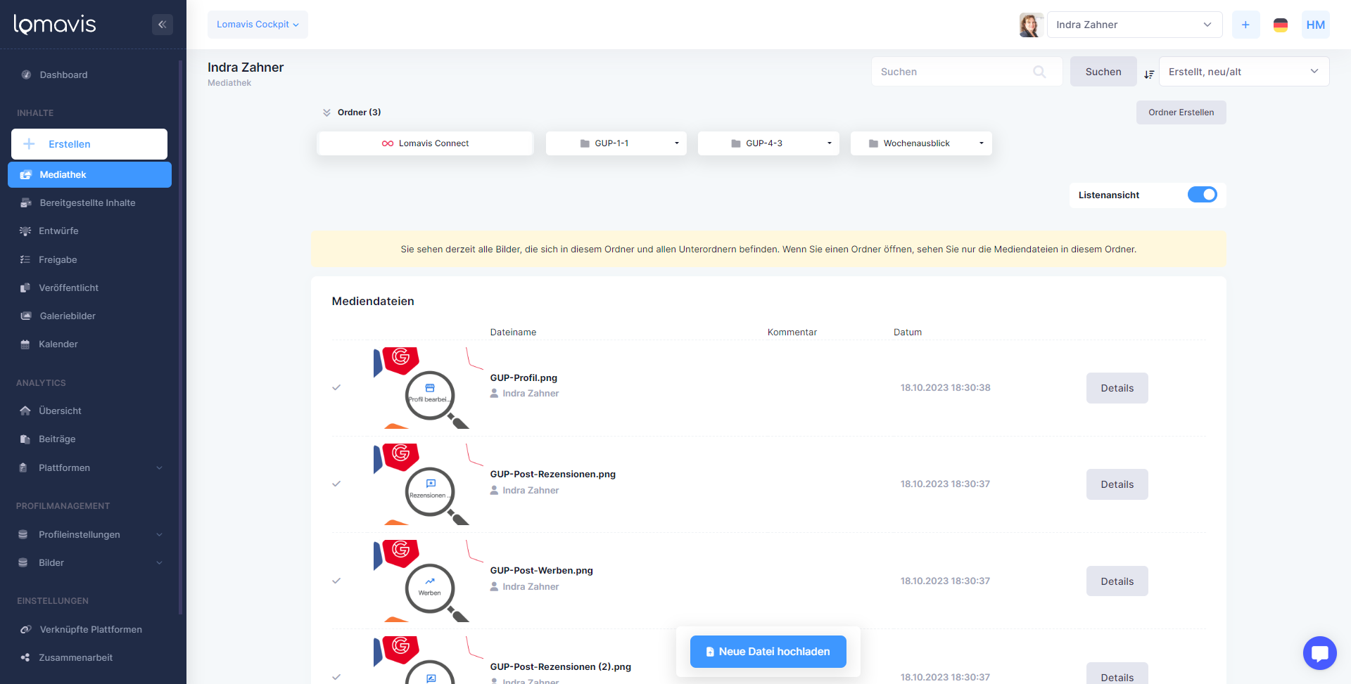 In der Mediathek können Bilder und Postingvorlagen hochgeladen werden. Die Lomavis-Mediathek dient als zentraler Hub für Videos, Fotos und andere Dateien. Hier können Mitarbeiter und Teammitglieder problemlos Inhalte hochladen, die dann vom Redaktionsteam verarbeitet werden können. Dies ist nicht nur eine Zeitersparnis, sondern fördert auch die Zusammenarbeit innerhalb des Teams.