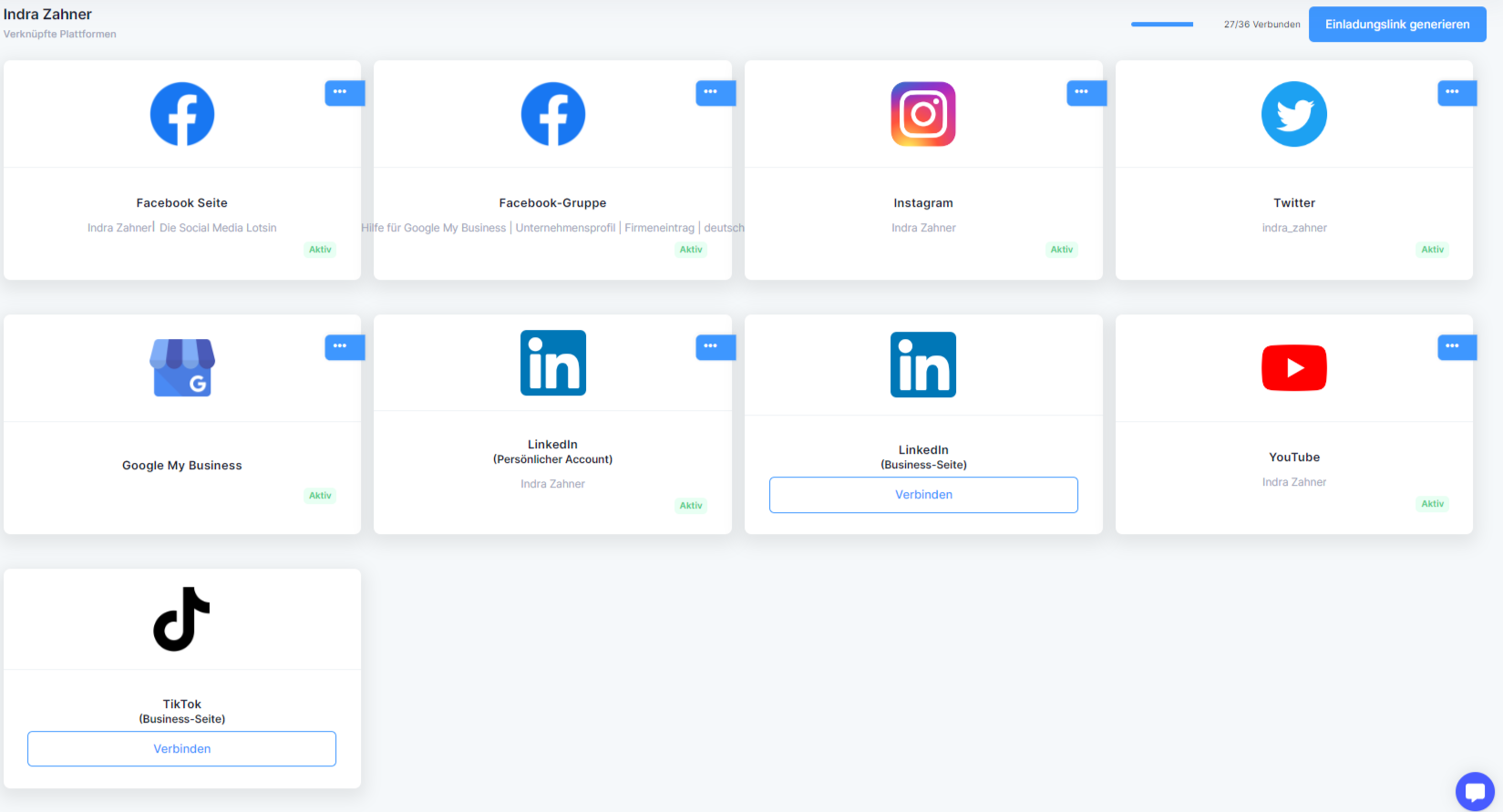 - die verbreitetsten Plattformen sind bespielbar (Facebook-Seite, Facebook-Gruppe, Instagram Business Account, Twitter, YouTube, TikTok, LinkedIn und das Google Business Profil*)