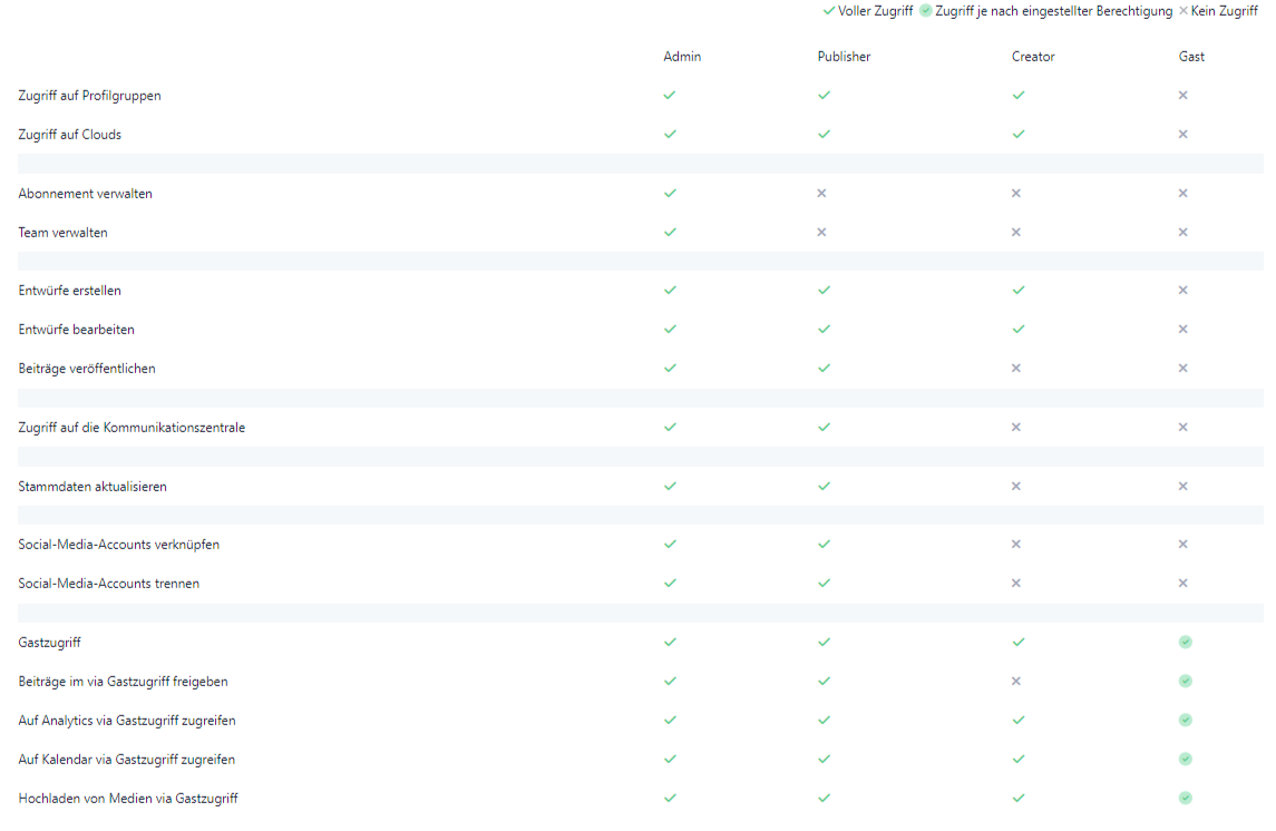 Publisher: Der Publisher hat fast die selben Rechte wie der Admin. Administrative Rechte, wie das Abonnement und Team verwalten geht nicht.