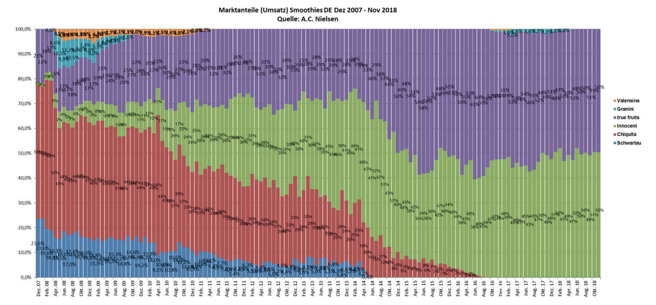 Das Unternehmen True Fruits wurde 2006 gegründet und war laut eigenen Angaben einer der ersten, die Smoothies in Deutschland auf den Markt gebracht haben. Gerade in der Gründungszeit verschaffte es der Marke einen Vorsprung. Zu Beginn bestehen die Kunden hauptsächlich aus Bars und Cafés und Fitnessstudios und dem ersten großen Kunden das Petit-Bistro von Aral. Nicht mal ein Jahr nach der Gründung werden die Produkte bei dem Lebensmitteleinzelhandel Rewe ins Sortiment aufgenommen. Ein Jahr später ist der Smoothie auch in anderen großen Einzelhandelsunternehmen, wie zum Beispiel Edeka und Metro gelistet.