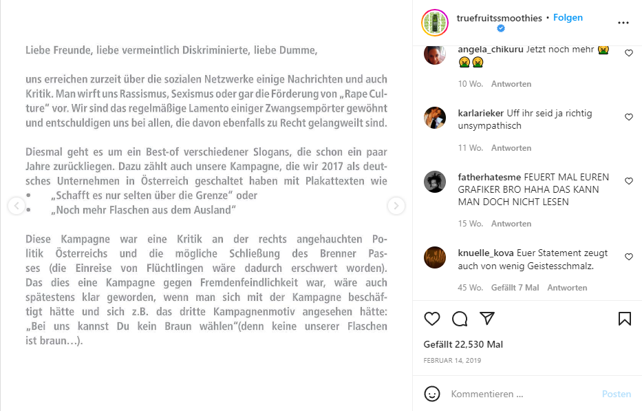 Seinen Werten treu bleiben und zu seiner Meinung stehen wird oft als Stärke ausgelegt. Allerdings kann dieses Verhalten auch dazu führen, dass konstruktive Kritik nicht ernstgenommen wird und eigenes Fehlverhalten nicht reflektiert wird. Die Firma True Fruits reagierte auf die Rassismus und Sexismus Vorwürfen mit einem Statement auf Instagram, indem sie Kritiker und „vermeintlich Diskriminierte“ mehrfach als dumm bezeichnen und erklären, dass es keinen Grund gäbe sich über die Kampagne aufzuregen. In diesem Beitrag wird deutlich, dass True Fruit zwar weiterhin zu ihren Aktionen stehen, aber jede Art von Kritik nicht ernst nehmen und somit einer ernsthaften Auseinandersetzung mit dem Thema aus dem Weg gehen. Die Kommentare lassen den Eindruck entstehen, dass das Unternehmen sich mit diesem Statement noch weiter in den Shitstorm manövriert.