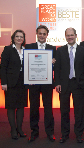 Preisverleihung: Deutschland beste Arbeitgeber 2009, 1. Platz für impuls Finanzmanagement AG (von rechts: Bundesarbeitsminister Olaf Scholz, Herbert Nißel (Vorsitzender impuls Finanzmanagement AG), Indra Zahner (Mitglied der Geschäftsleitung der impuls Medien & Marketing GmbH)